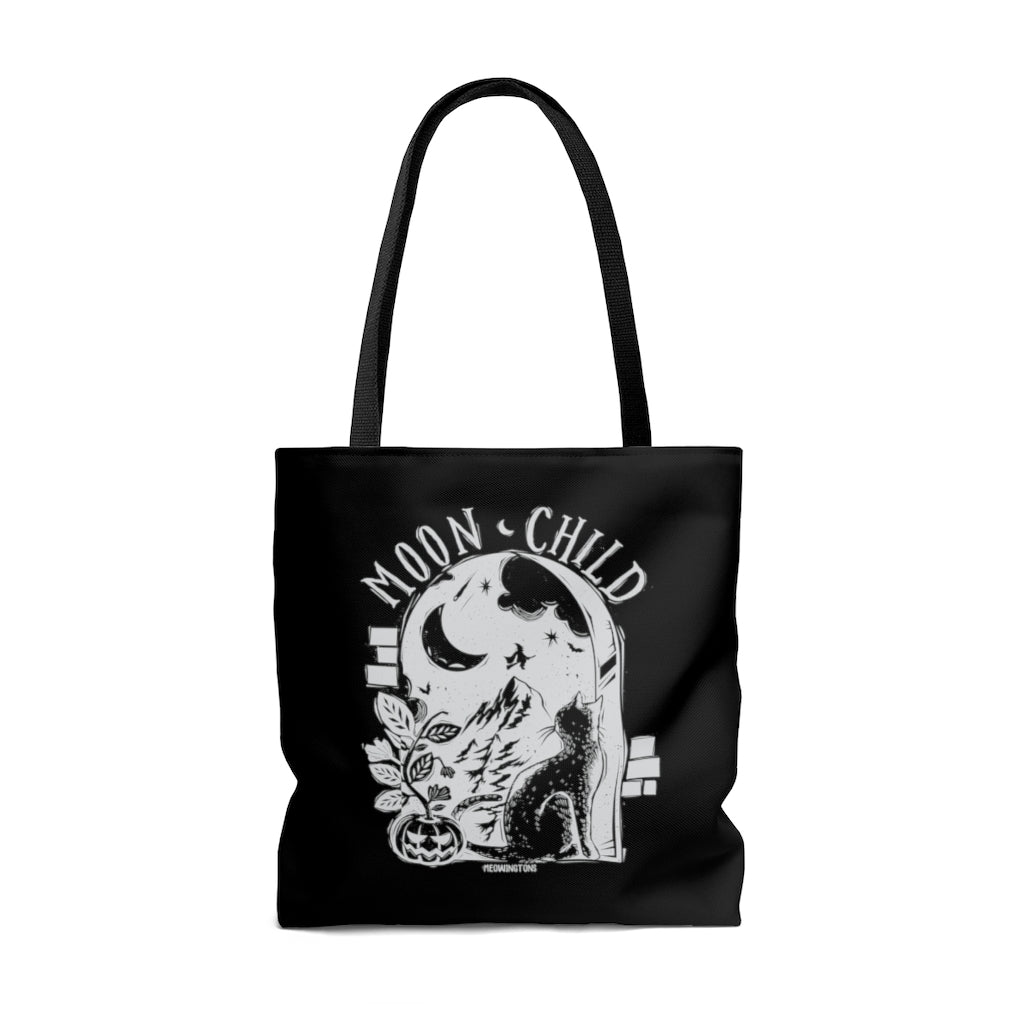 Inspired by the bold lines of linocut printing, the Moon Child Cat Tote Bag features a stargazing cat admiring a crescent moon far above. The starry night sky is filled with the spirits of Halloween, from a witch flying high on her broomstick to fluttering bats and even grinning jack-o-lantern. Get into the spirit of All Hallow’s Eve while channeling your inner Moon Child!