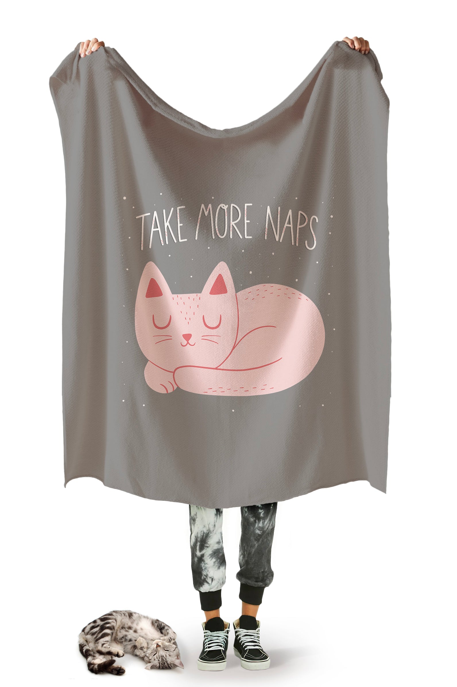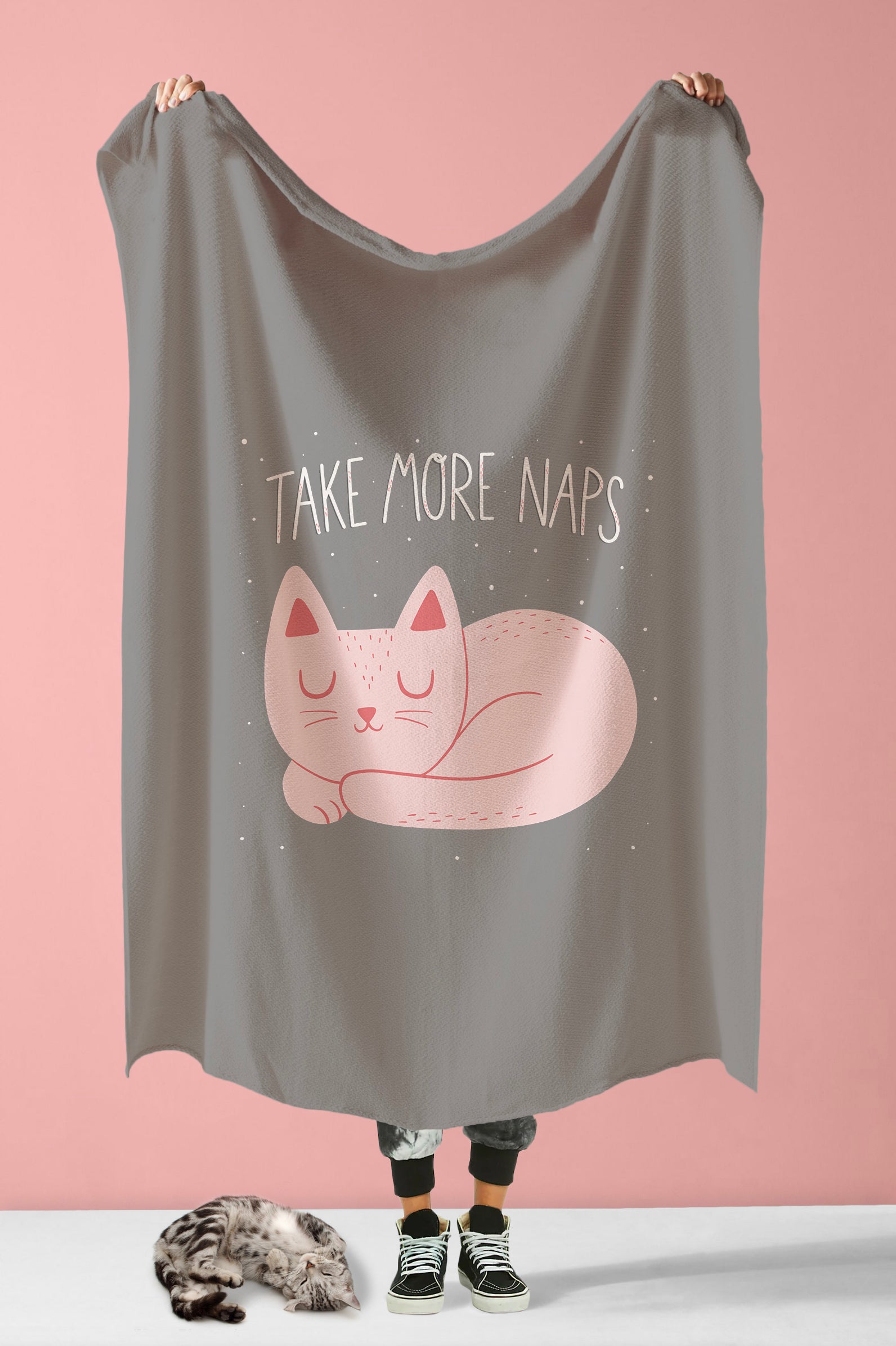 Whether you’re looking to snuggle up on the couch and binge some Netflix or curl up in bed with your favorite book, the Take More Naps Sherpa Blanket is ideal for any room in the house. Our cute cat throw blanket features a soft, warm grey background with a pastel cat print that is sure to bring a bit of warmth and color to any room. Our Take More Naps Sherpa Blanket is the purrfect blanket for year-round comfort; and it’s so cute you simply won’t want to wait ‘til winter comes around to use it! You can happily drape it over your favorite chair or sofa for regular use, and even take it on the road so you can catnap on the go.