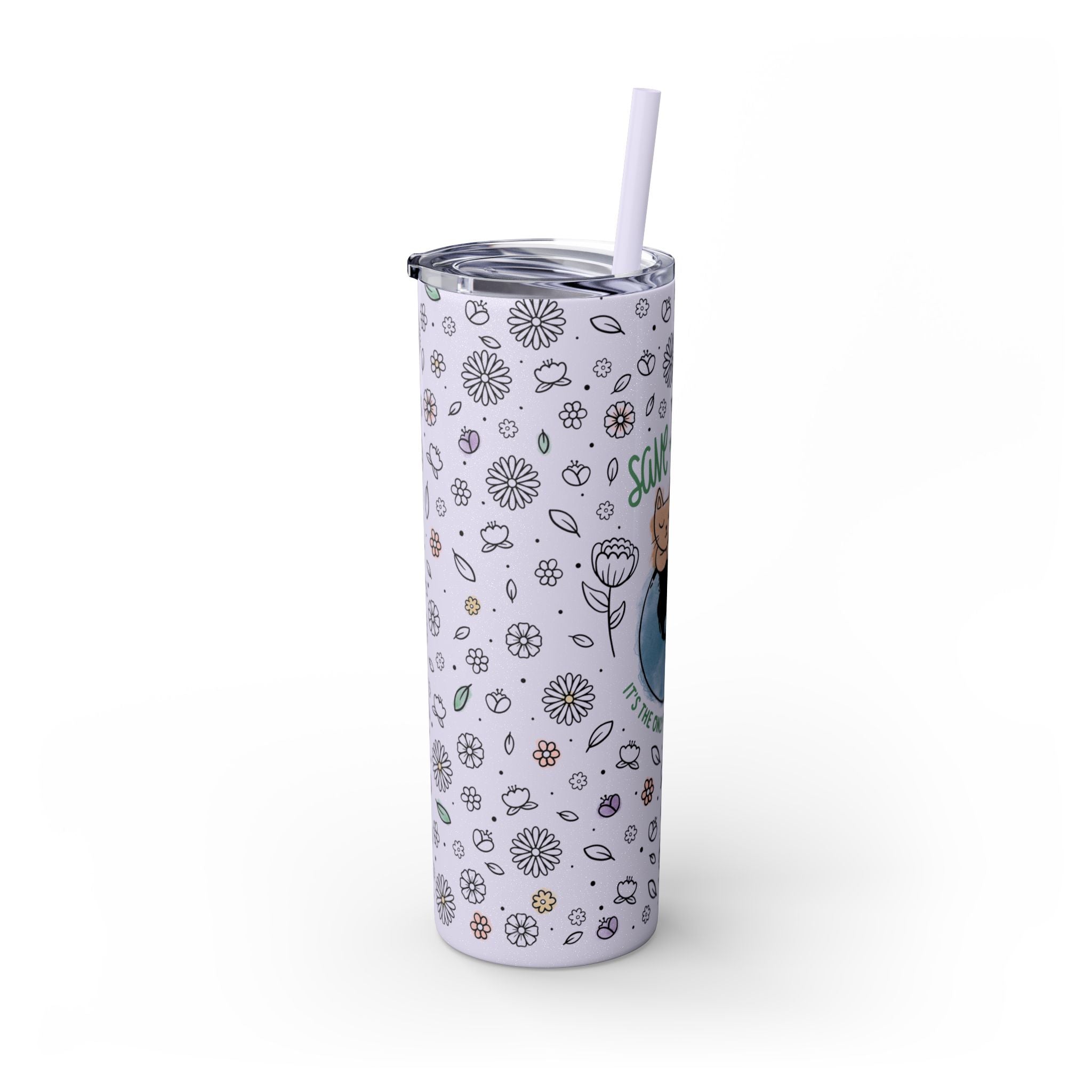This reusable stainless steel tumbler features our signature quote, “Save the Earth: It’s the Only Planet with Cats,” set against a whimsical floral pattern and soft pastel watercolor accents. The glossy glitter finish adds a sparkling touch that catches the light and turns heads wherever you go.